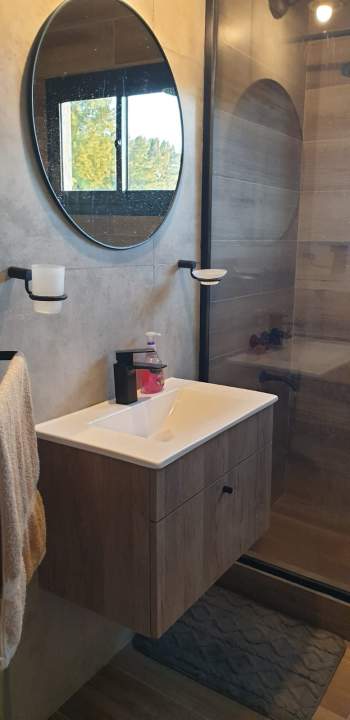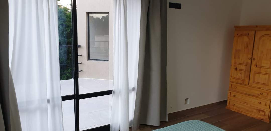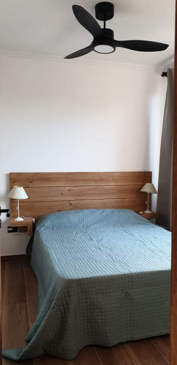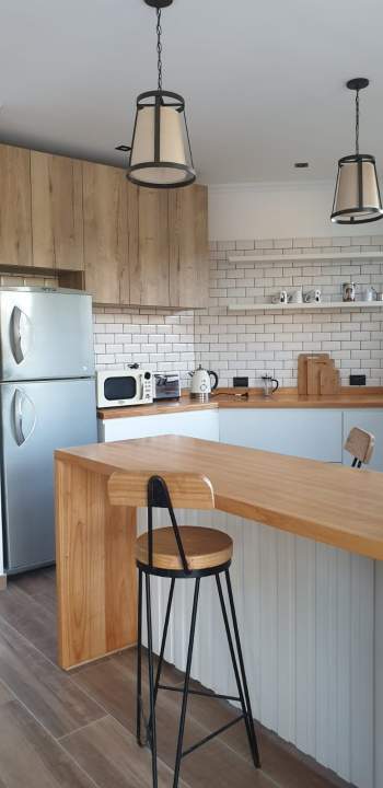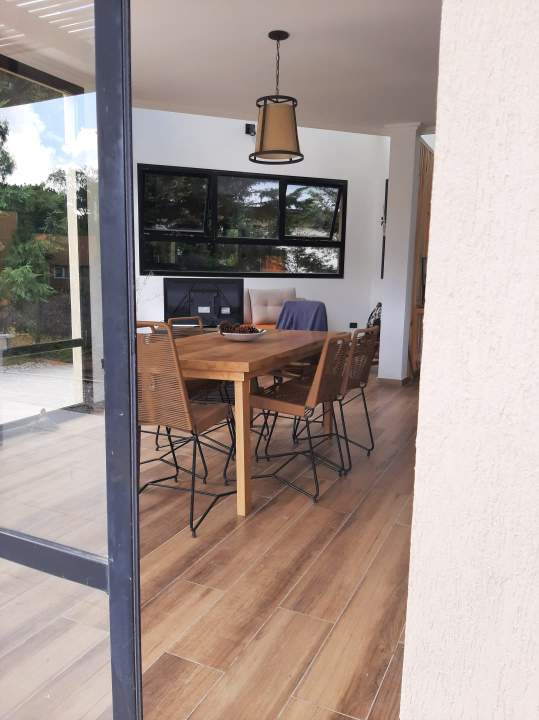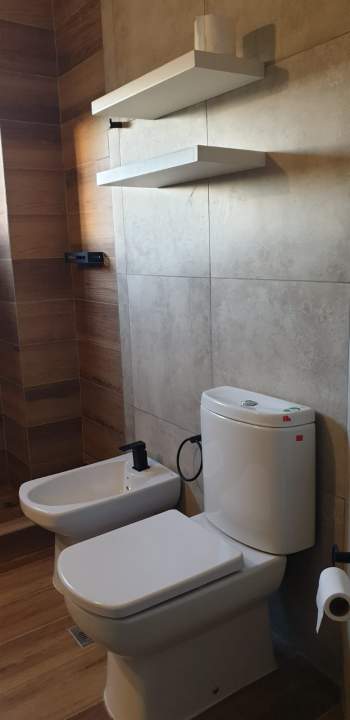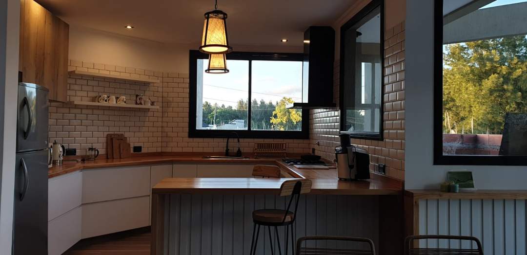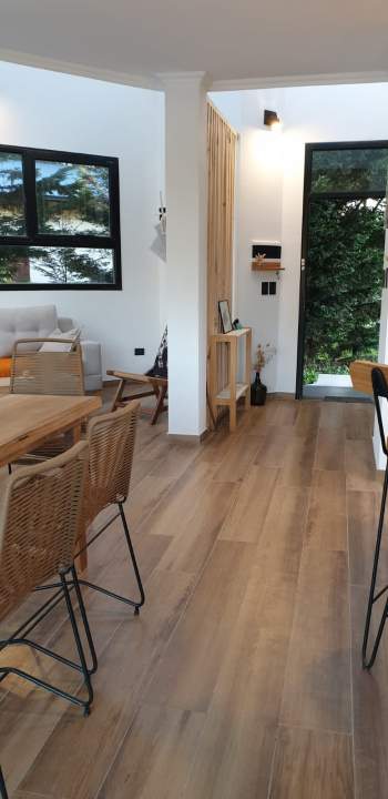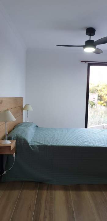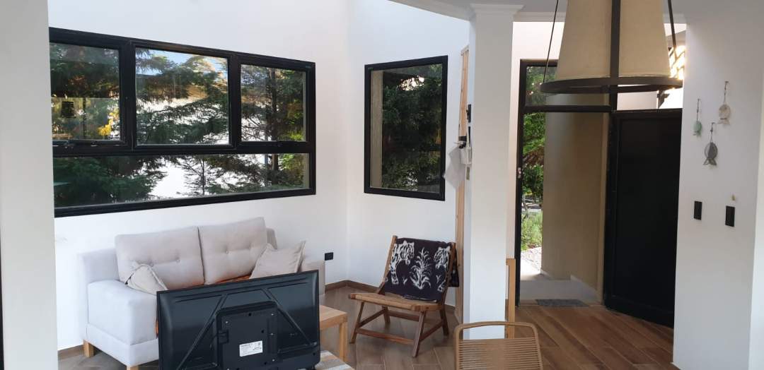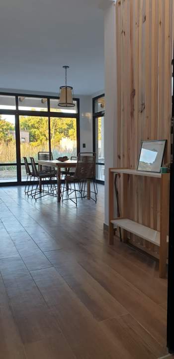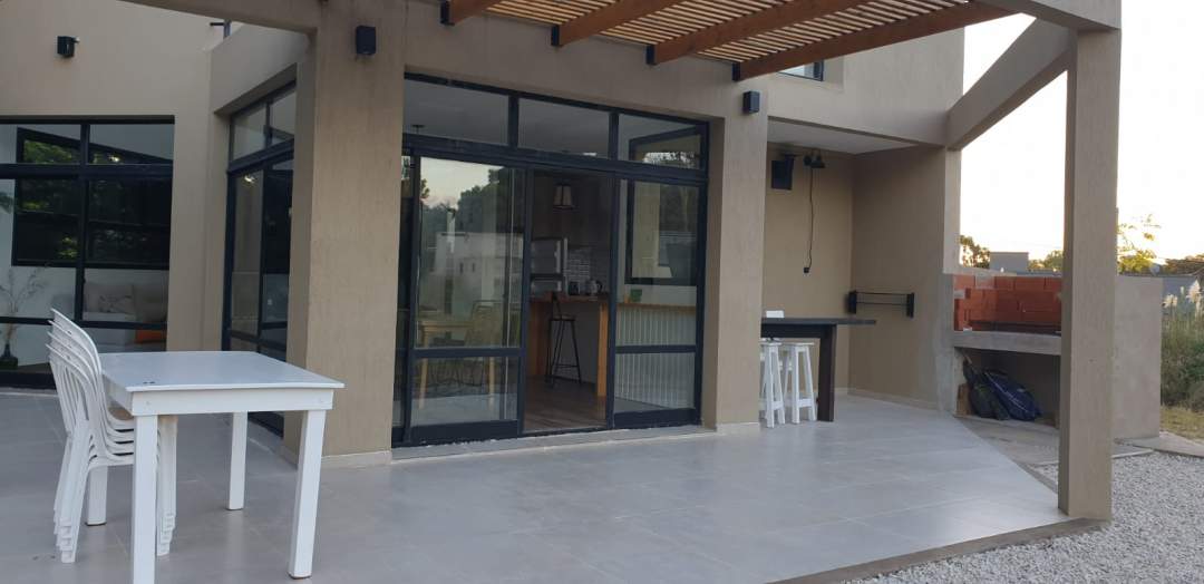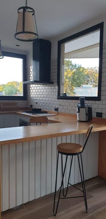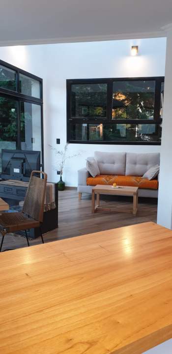 En planta baja cuenta con un espacio integrado con cocina comedor y estar con TV, salida al patio fondo con parrilla, mesa y sillas de exterior. Un dormitorio matrimonial y baño completo.